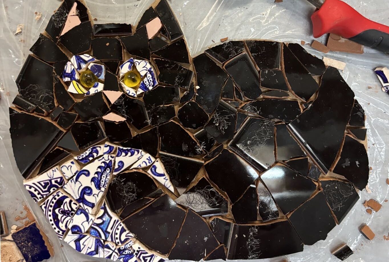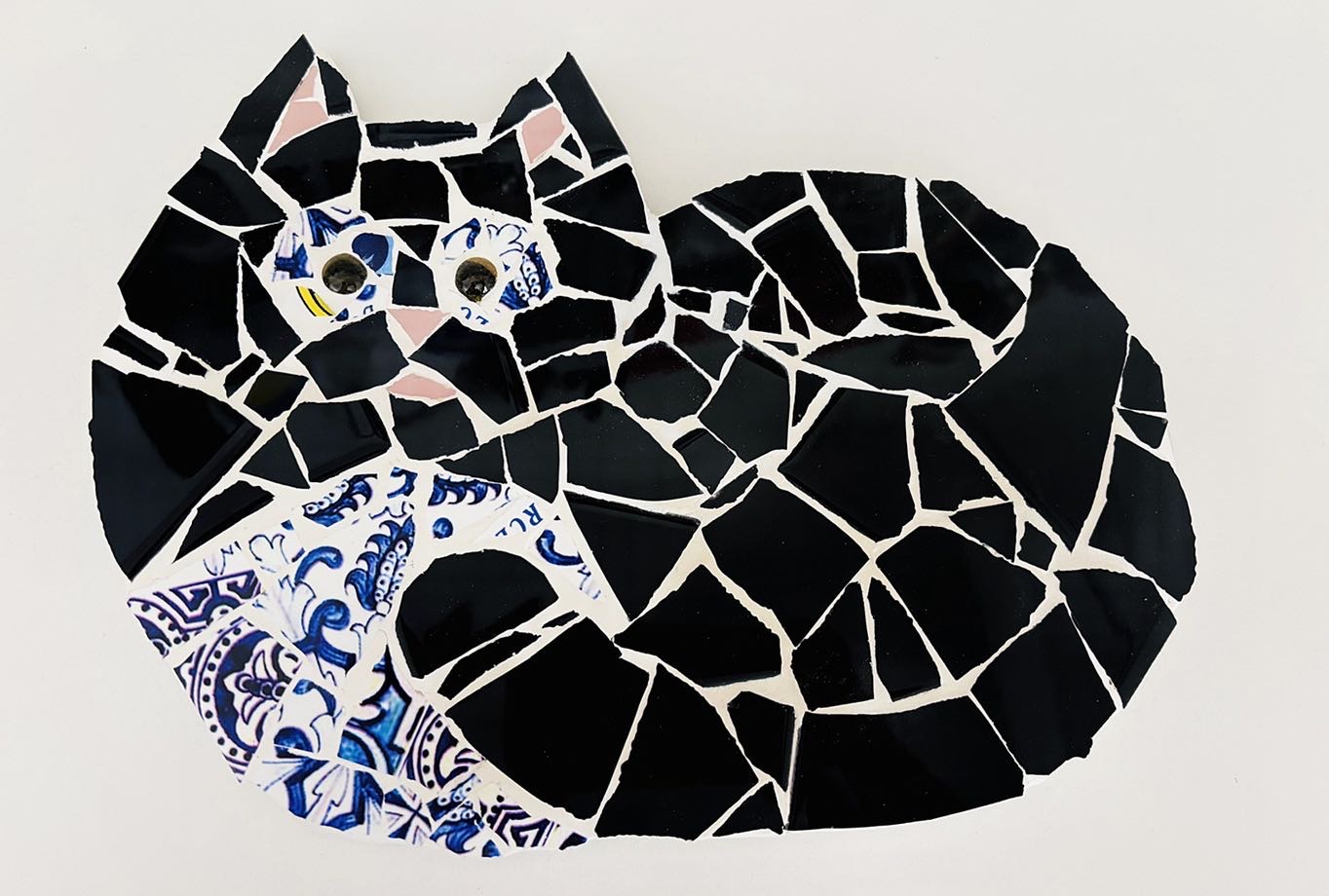 Fragments of used ceramic tiles are reassembled into small mosaic panels with simple, meaningful imagery — exploring fragility, memory, and restoration.