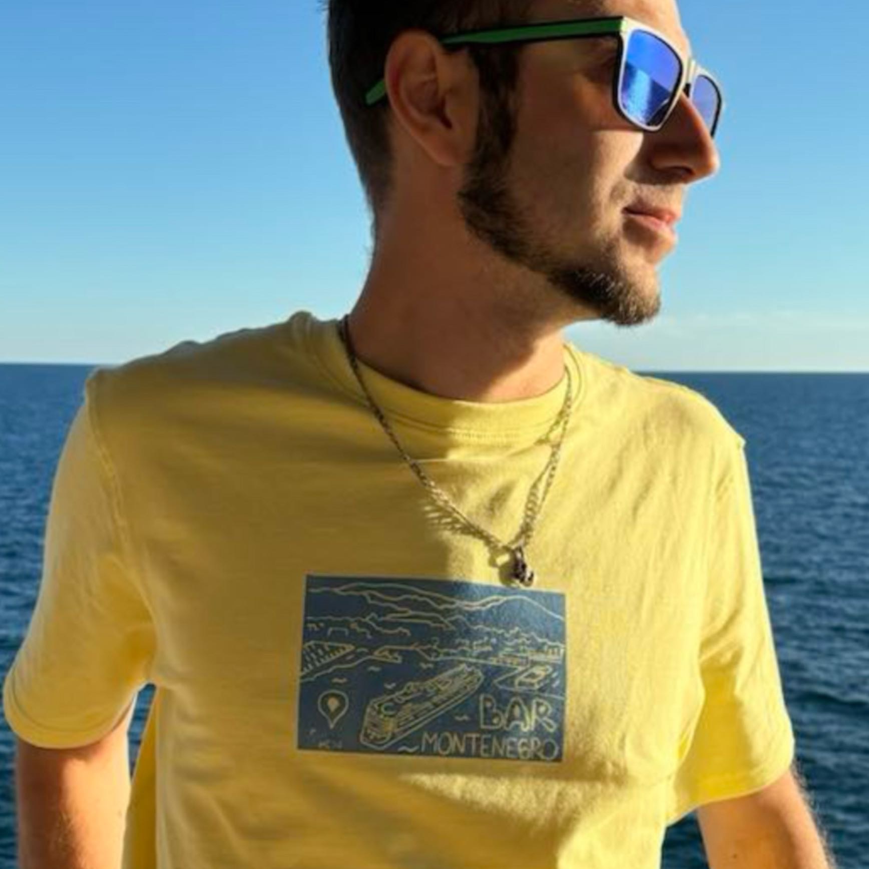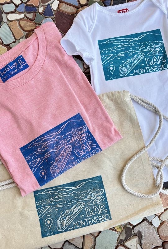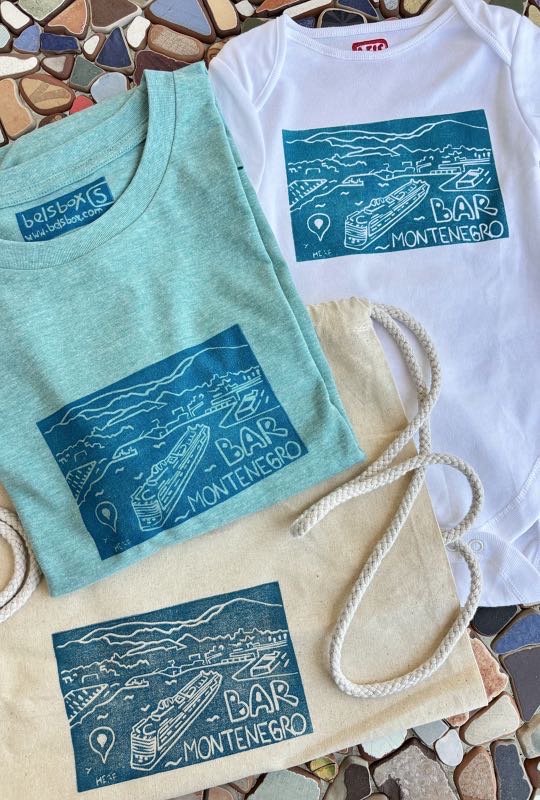 Each piece features a hand‑printed design of a cruise ship arriving at the Port of Bar, Montenegro — a symbol of new adventures, sunny days, and unforgettable journeys.