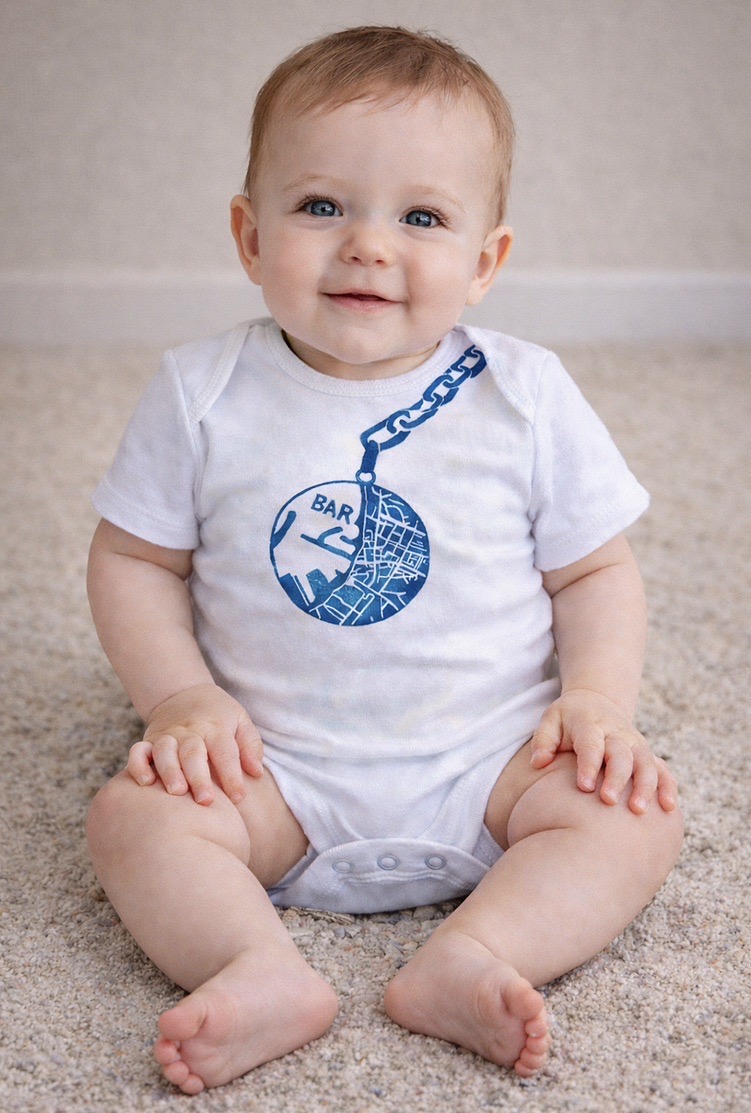Is your baby already planning their first grand adventure? Help them get a head start with this adorable white bodysuit, hand-printed with a linocut map of Bar, Montenegro — dangling from a chain like a precious medallion. Whether you have a special connection to Bar or just love unique designs, this tiny tribute to travel is sure to charm.