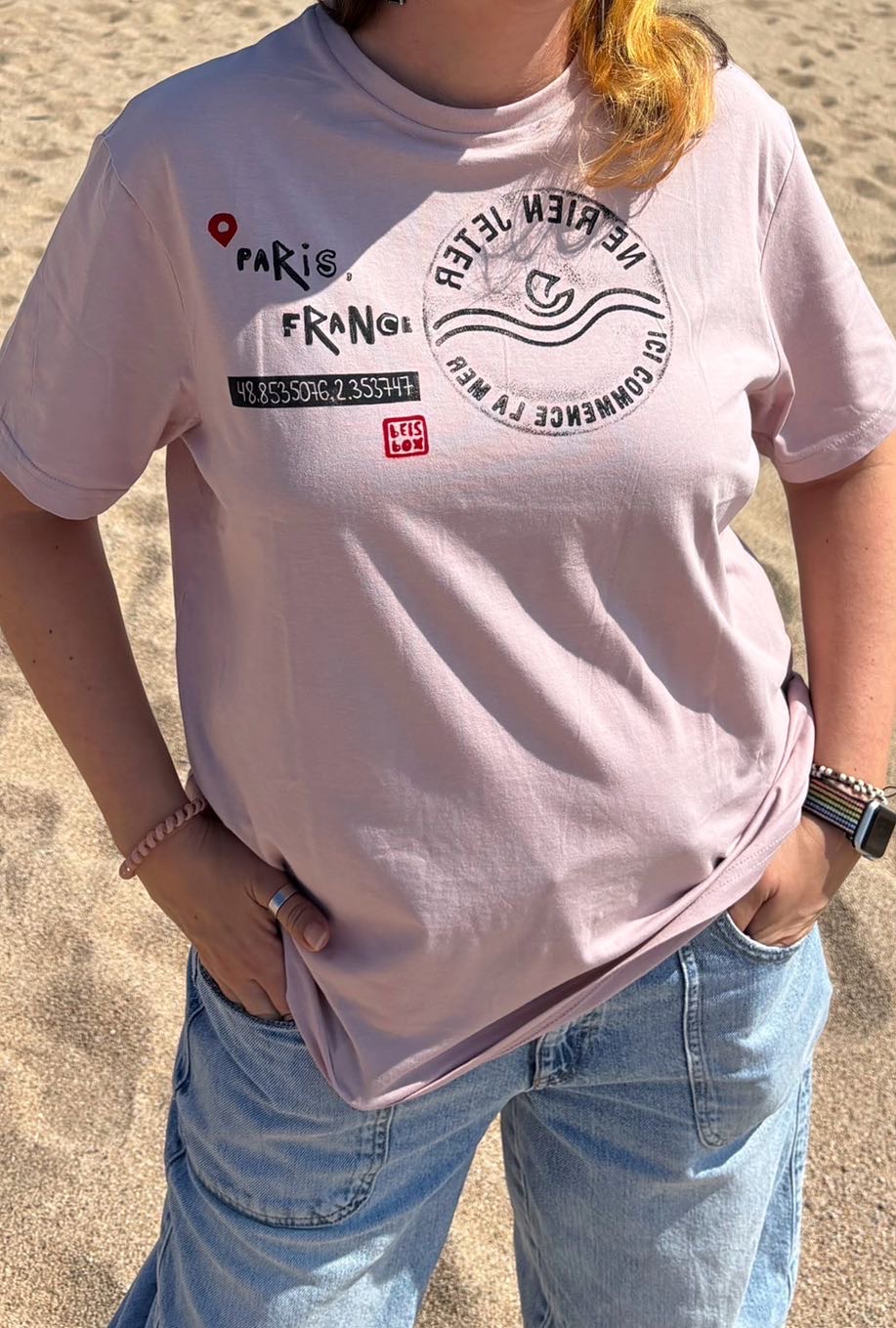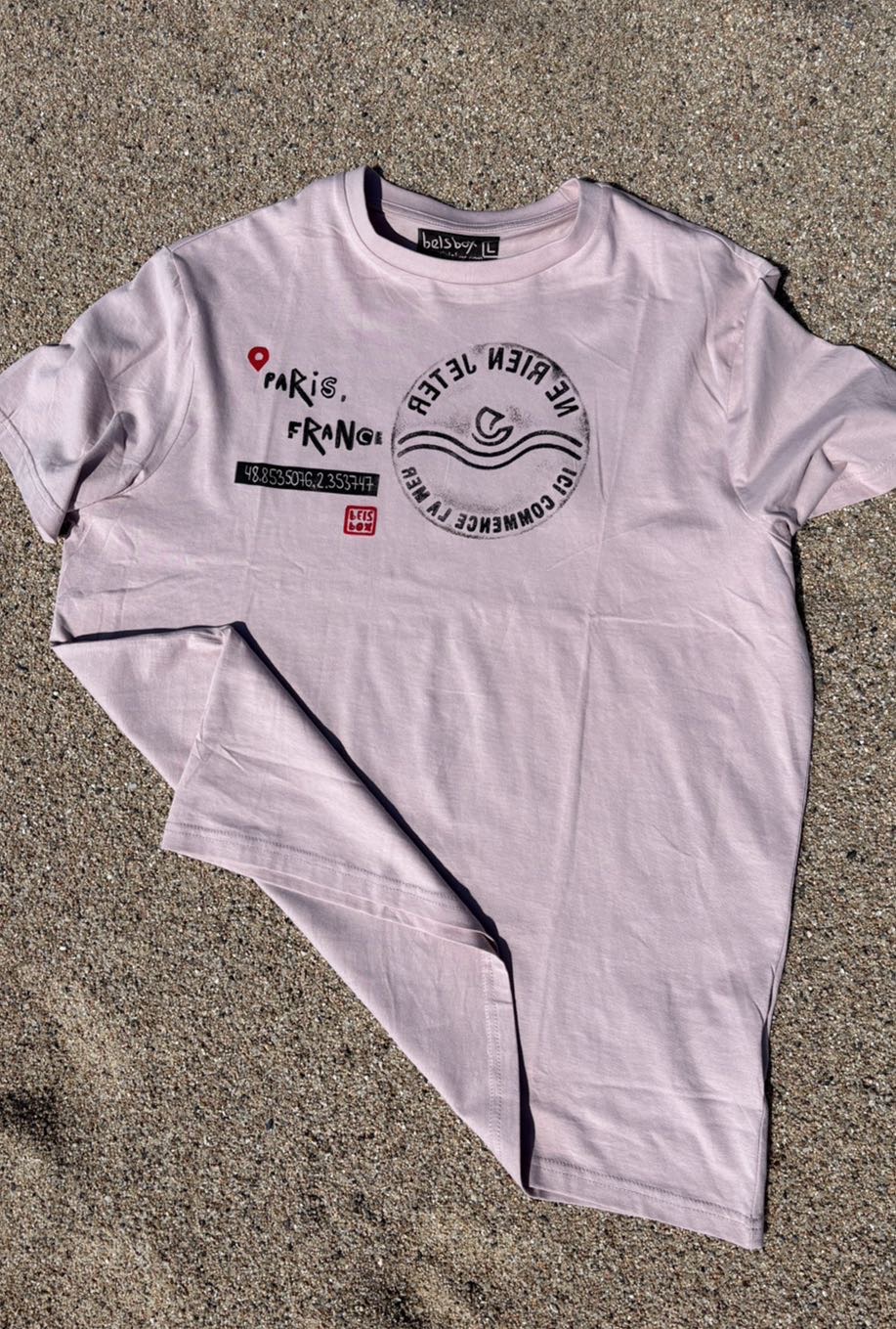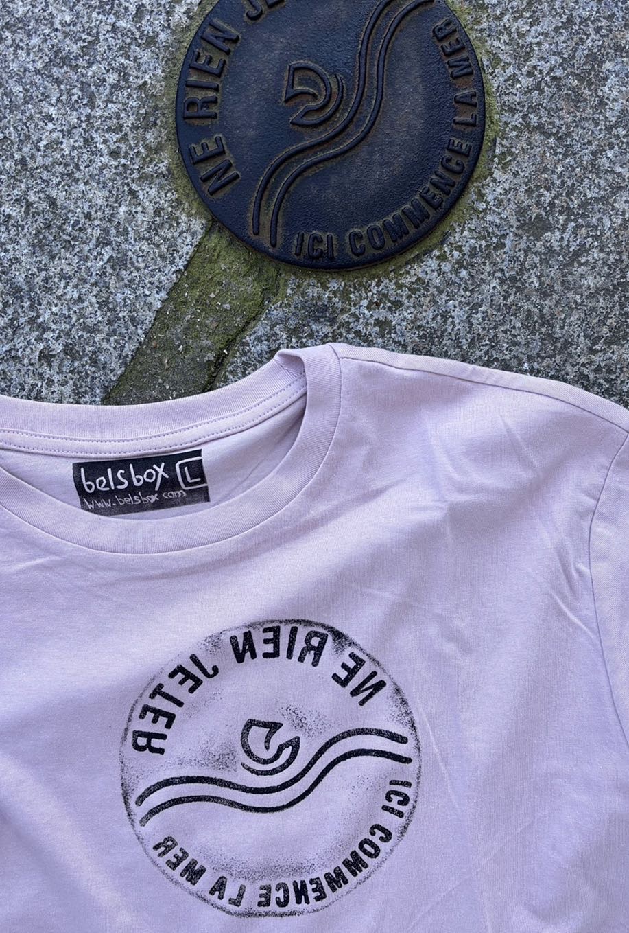 This unique dusty pink t-shirt features a direct print from an old and rare manhole cover located in the very heart of Paris, right by the River Seine and near the famous Notre-Dame Cathedral. The inscription in French, “Ne Rien Jeter – Ici Commence La Mer”, translates to “Do Not Throw Anything – The Sea Begins Here.” It’s a poetic and powerful environmental message, reminding us that city waste flows into the ocean.