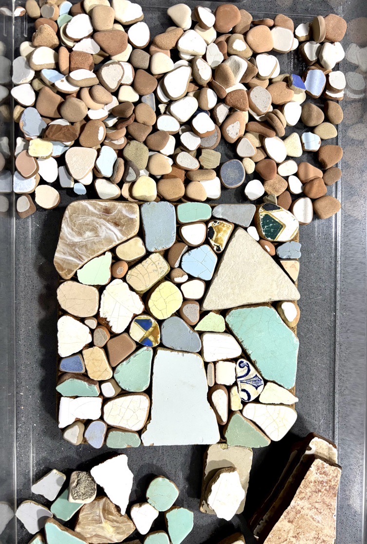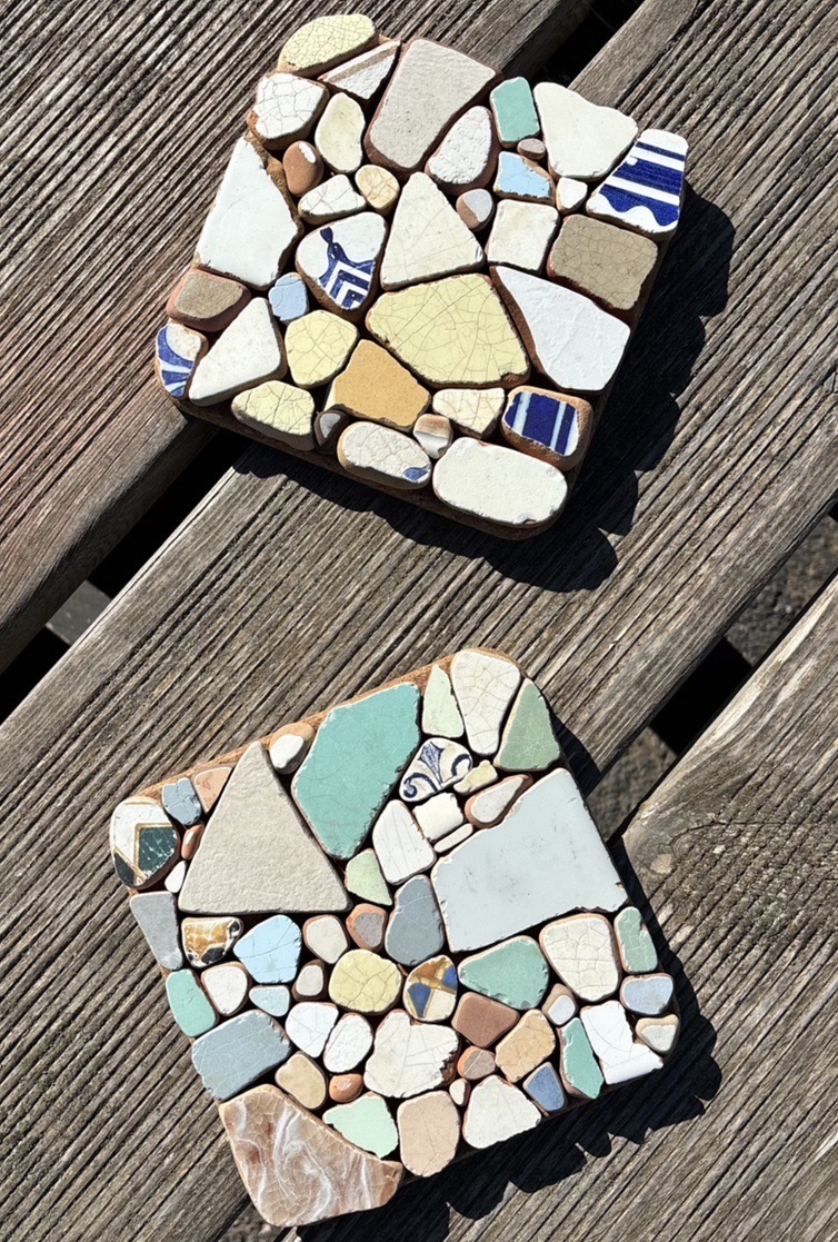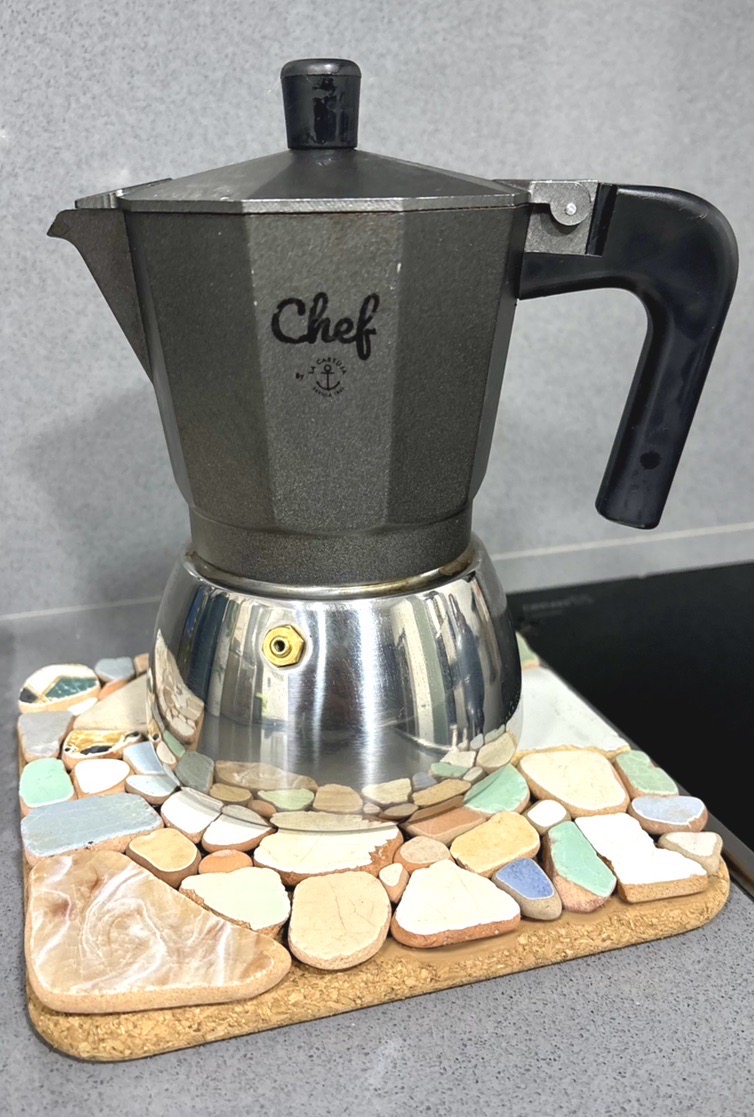 Square Sea Tiles Trivet a unique handmade piece created from real ceramic fragments shaped by the sea. Each tile was softened by waves and time before being carefully arranged into a mosaic on a natural cork base.